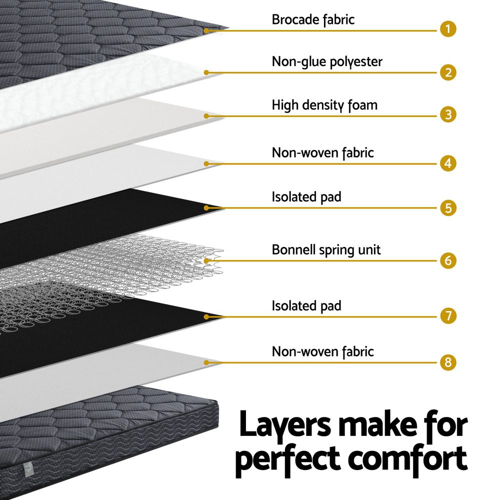 Built with durability in mind, the mattress boasts a Bonnell spring core with 6-turn coils for resilience and support. High-density foam layers add an extra touch of comfort, while the excellent edge support ensures stability and prevents sagging. Whether for a master bedroom or guest room, this mattress delivers quality sleep night after night.