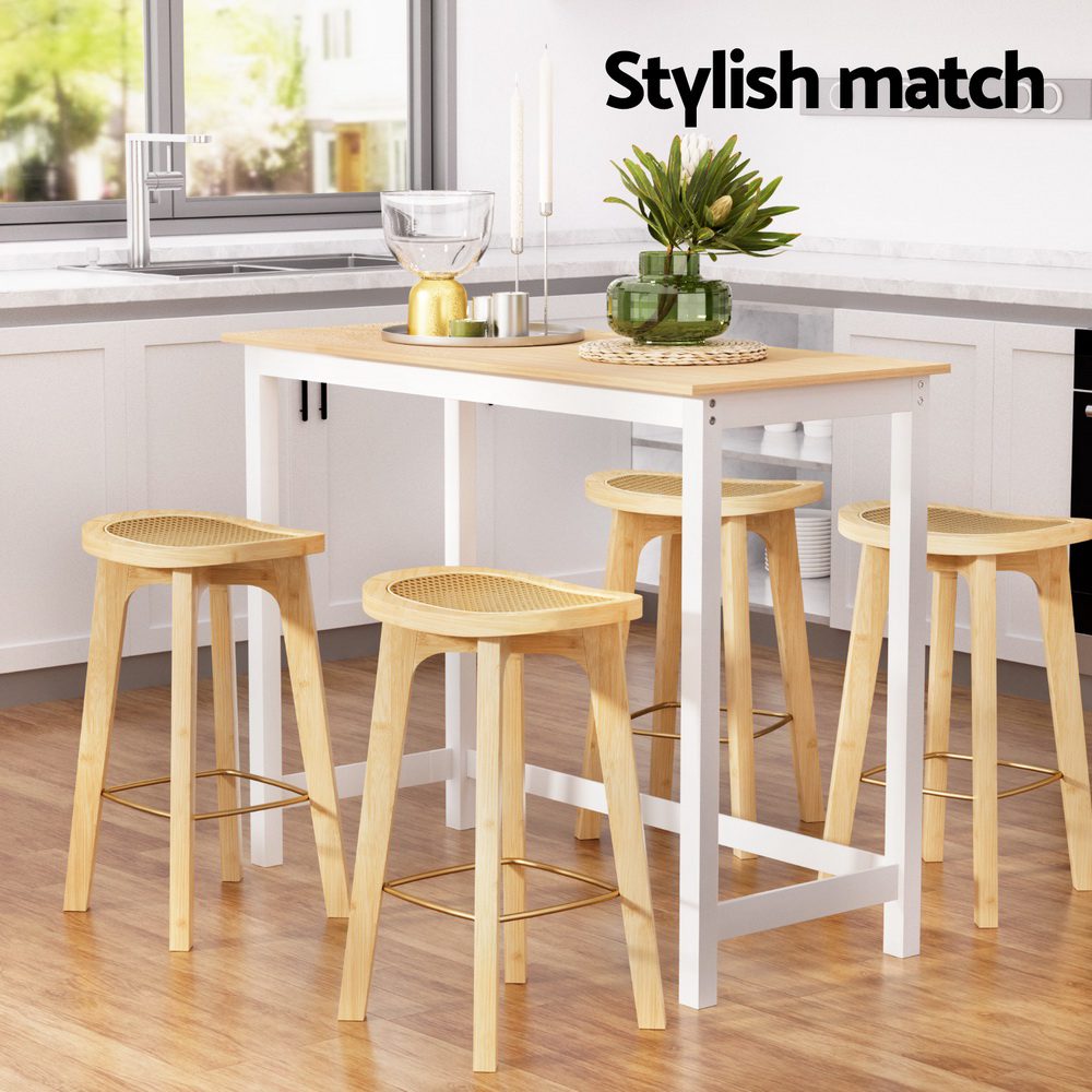 Enhance your space with this elegant Bar Table and Stools Set, combining natural materials with a sturdy design. The bar table features solid wood legs, a 30kg weight capacity, and a sturdy L-shape structure with floor protectors for stability. The bar stools boast a bamboo frame, a stylish rattan seat, and a gold-painted footrest for added support. Anti-slip floor protectors and smooth edges ensure safety and durability. With easy assembly, this set is perfect for kitchens, dining areas, or bar spaces.