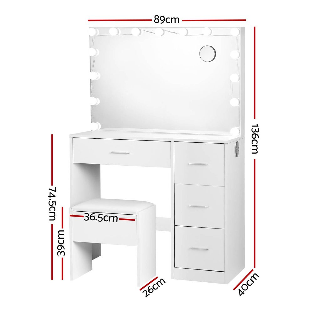 Feel like a star straight out of Hollywood with the Artiss Darcy Dressing Table. Packed with generous storage and other convenient features, your new beauty routine will be a breeze. Made from quality MDF particleboard with a melamine finish, the table is built to last. The Hollywood-style makeup mirror is surrounded by bright LED bulbs for the perfect illumination. Choose from warm, neutral and daylight white light so you can always look stage-ready. The vanity features four generous storage drawers with silver handles open smoothly on anti-rust runners, giving you instant access to your beauty essentials. A foam-padded PU leather stool allows you to sit comfortably while applying make-up or skincare and can be neatly tucked away when not in use. Easy to install and even easier to maintain, you’ll love getting ready for the day in front of your new Artiss Darcy Dressing Table.