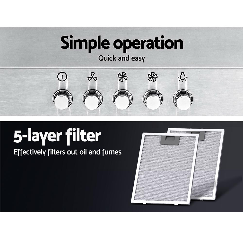 Say goodbye to smoky fumes and unwelcome cooking odours with our Devanti Range Hood. With its high-performance motors, the brushed stainless steel range hood provides a steady upflow and filtered extraction of fumes and oil to keep your cooktop area clean and fresh after every use. With its 3-speed rocker button switches, the extraction speed can be adjusted to suit the circumstances. Other features include three non-stick 5-layer aluminium filters that are removable and replaceable and bright LED lighting to facilitate your illuminated cooking. The range hood is wall mounted and the chimney can be adjusted to fit the installation space.