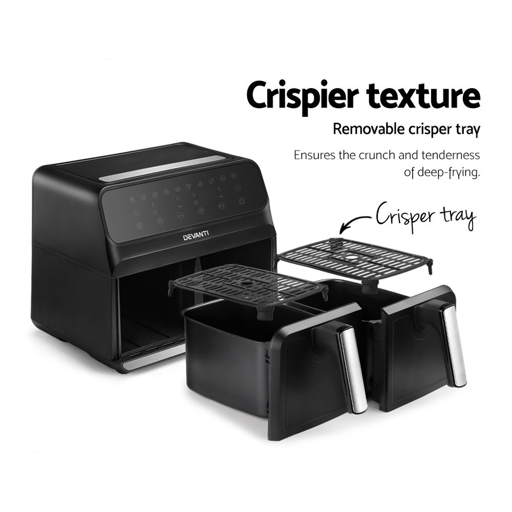 Enjoy your favourite fried foods without guilt thanks to the Devanti 8L Air Fryer. With their smooth and stunning sleek exterior, our Devanti Air Fryers turn ordinary food into extraordinary dishes thanks to their exceptional cooking abilities. With its innovative air frying technology and 1700W of power, heat is evenly dispersed throughout the air fryer so you can cook quickly and efficiently. The 8L capacity is suitable for a full set of meals from sides to mains, and the dual 4L baskets can be set at separate temperatures and times so you can save time and cook multiple dishes at once. Better still, all this wonderful cooking is done without a drop of oil and is as delicious and succulent as your favourite fried treats. Foods cooked in our air fryer have up to 80% less fat than regular deep-fried foods. Choose the time, temperature and cooking preset with the easy-to-use LCD touch control panel. The interior features a non-stick pan for easy cleaning and a removable crisper tray for the ultimate crispy, crunchy experience. It also features an automatic shut-off switch, a cool touch handle, a heat shield vent, and non-slip feet for safety. Most importantly, the components are all dishwasher-safe, making cleaning as easy as pie. Get yours today and see the benefits of fat-free cooking!