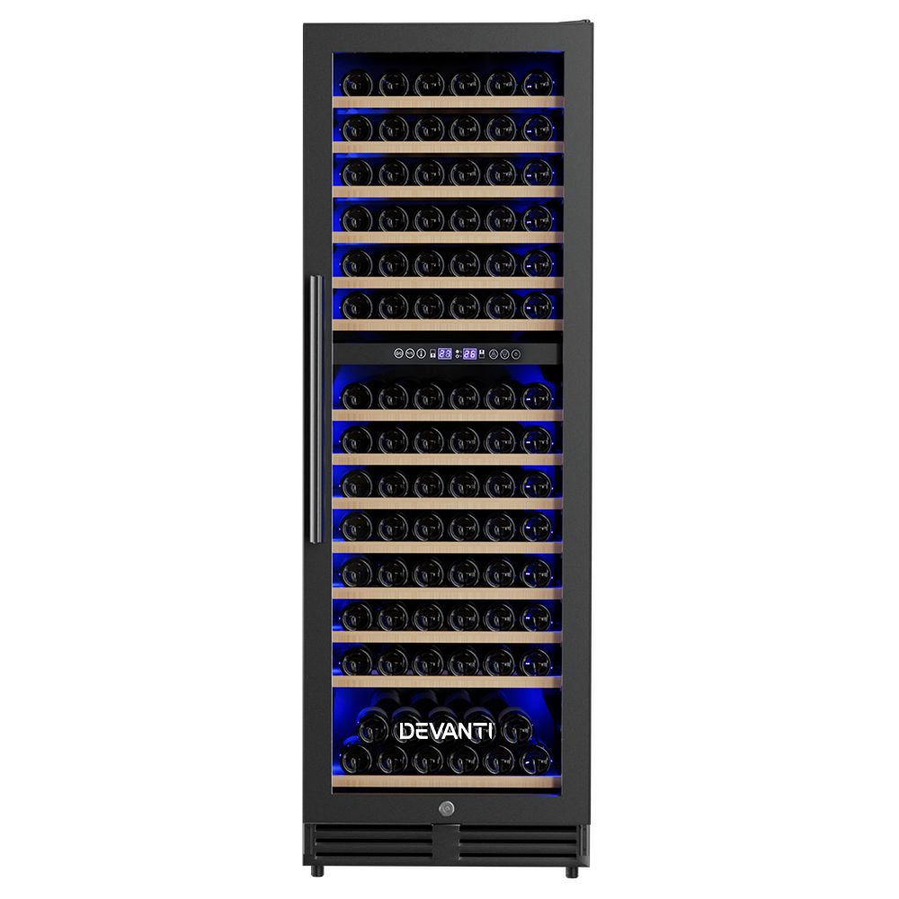 Need a reliable way to store your wine collection? Look no further than our Devanti Wine Cooler. Utilising the latest high-precision Jiaxipera compressor cooling technology, our wine cooler ensures your favourite vintages are well kept at their recommended temperatures with its circulated cool air. The cooler has a dual zone system with two separate temperature-controlled zones, ensuring perfect cooling temperatures for both white and red wines. The temperature can be set between 5? and 13? for the upper zone (which is suitable for dry white and sparkling wines), and between 12? and 18? for the lower zone (which is suitable for red wines). The digital control panel makes for easy temperature adjustments while the built-in LED lights help you to see your wines in the best light. The stylish design stores up to 154 bottles of wine in a neat and tidy wood shelving system. Better still, the double-glazed glass door is UV-resistant and provides excellent insulation. The ensemble works quietly and efficiently and has a built-in lock for total peace of mind. Suitable for both home and commercial use. Treat your vintage collection with the care it deserves – invest in a Devanti Wine Cooler today.