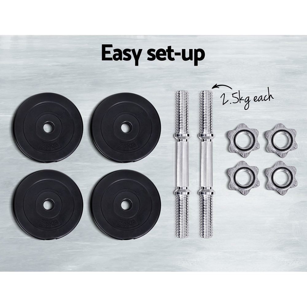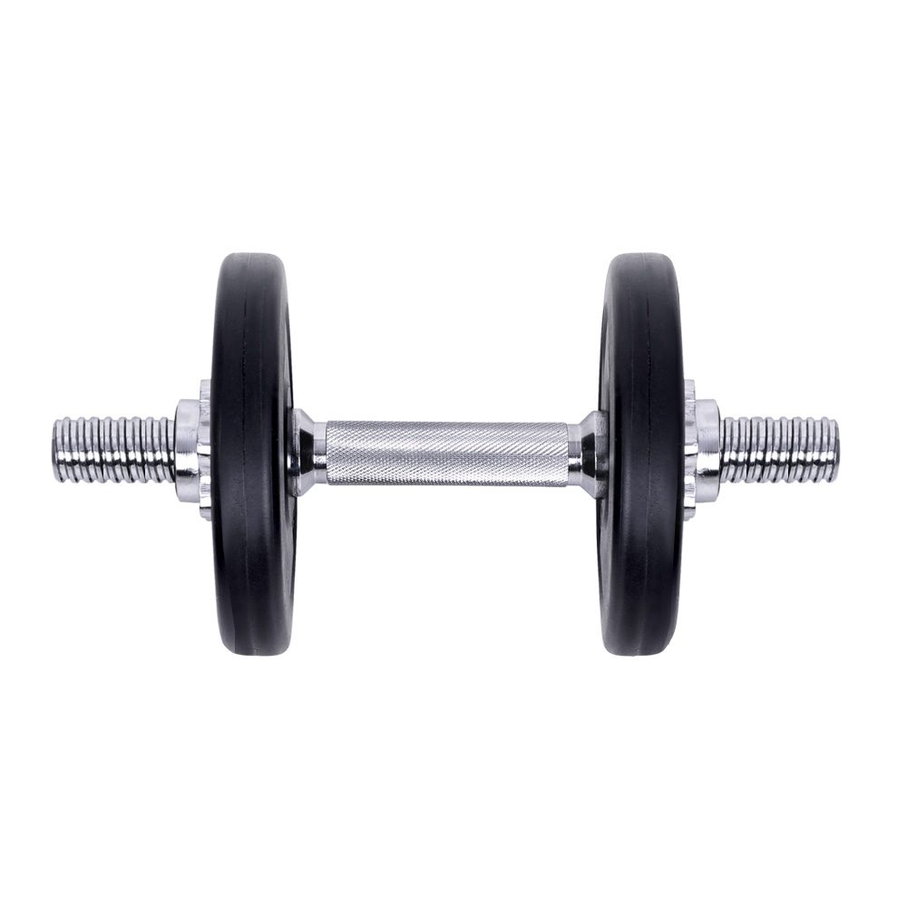 Time to get tough. If you are looking to boost those triceps, biceps and shoulders, our 15kg Dumbbell Set is the perfect deal for you. Whatever your game is, our dumbbell set lets you strengthen and tone those muscles your way. This commercial-grade set features a high-quality bar with non-slip handle that offers optimal gripping surface. Each weight plate weighs 2.5kg and is made of cast cement coated with smooth plastic, reducing clanging sounds and making them more floor-friendly. You can adjust the weight of the dumbbell by removing the weight plate and only using the dumbbell bar (weighing 2.5kg each) or adding more compatible weight plates. The high-quality star-shaped nuts ensure the weight plates stay securely in place for safe workouts. Best of all, the dumbbell comes in a set of two (two 7.5kg dumbbells for 15kg total) so that you can exercise both arms at the same time. Gym junkie or workout pro, you can get fit easily with our 15kg Dumbbell Set.
