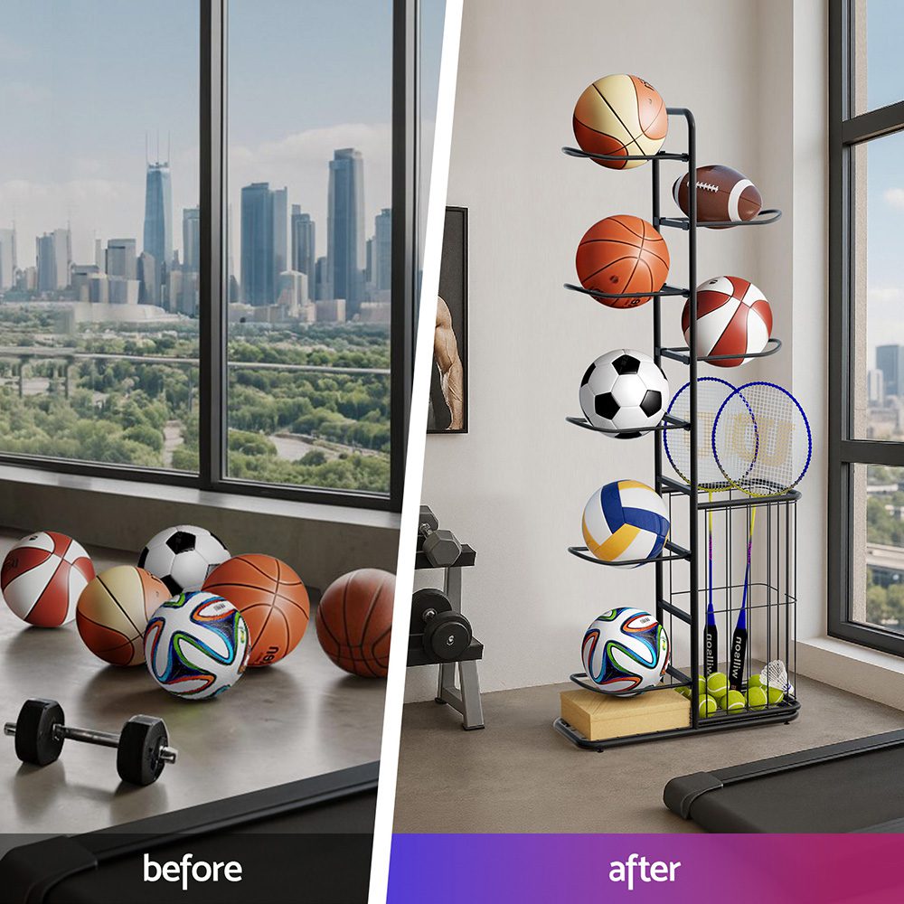 Tired of cluttered sports gear? The Everfit Ball Storage Rack is your Sports Equipment Organizer, designed for Aussie families, coaches, and fitness lovers. This Heavy Duty Ball storage rack basketballs, footballs, and volleyballs securely in its 7-tier rack, while the thoughtful side storage bin conveniently holds baseball bats, badminton rackets, or tennis rackets��keeping all equipment in one place. Perfect for garages, home gyms, or outdoor courts, it features easy assembly, steel frames for durability. Ventilated baskets prevent moisture buildup, and the compact footprint suits small spaces. Whether you’re a parent managing kids’ gear or a coach organizing team equipment, this Ball Storage for Indoor and Outdoor ensures everything stays tidy and accessible.