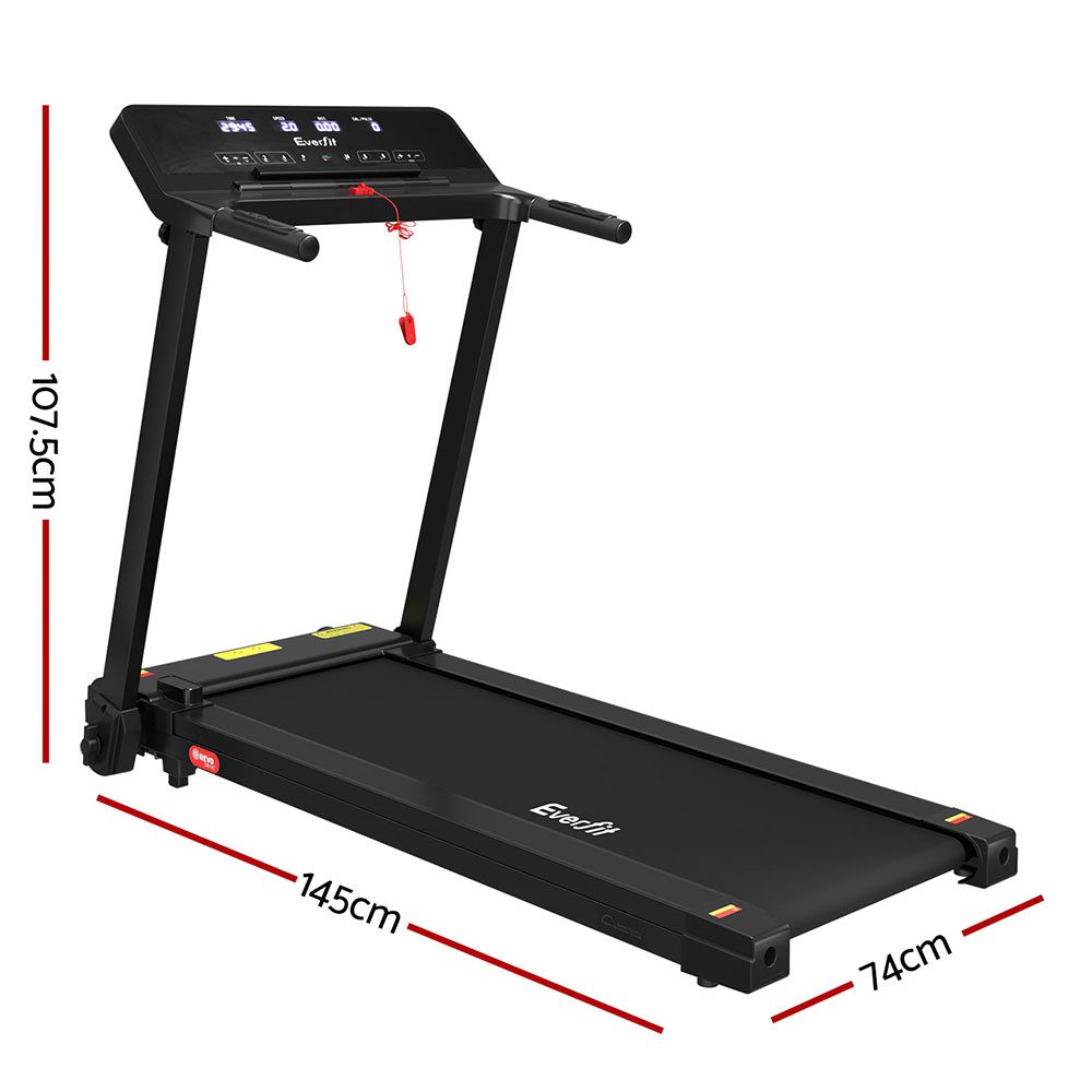 For a truly effective approach to weight loss and toning, our Everfit Fitness Treadmill is your perfect companion. Compact and sturdy with its powder-coated steel frame, the treadmill allows you to perform essential cardio exercises within the comfort of your home. The treadmill features 12 pre-set training programs designed to simulate natural terrain. A user-centric control panel with a digital LCD display lets you set up speeds of between 1km/h and 14km/h and monitor other parameters. Its powerful and energy-efficient motor produces smooth and seamless operation and the anti-slip belt and soft-grip handlebar make your session a comfortable and controlled experience. When all the hard work is done, fold and store away the compact treadmill away easily. Other great features include safety tether key, smooth wheels for easy mobility and tablet holder. For health results that matter, our fitness treadmill is the one to run to.