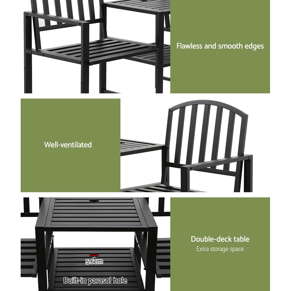 With its modern rustic vibes, the Gardeon 2-Seater Garden Bench is the perfect outdoor tete-a-tete set to spend the day with your friends. Made from black steel with an impeccable weather-resistant finish, the bench has a strong structure with a smooth, easy-to-clean surface and curved edges. With two integrated armchairs, an adjoining table and a double-deck design, the bench has plenty of sitting and extra storage space. A built-in parasol hole will fit an outdoor umbrella and keep your guests dry and in the shade. The classic design ensures your comfort is always forefront and the trending style will stand the test of time. Enjoy the outdoors this season with a Gardeon 2-Seater Garden Bench.