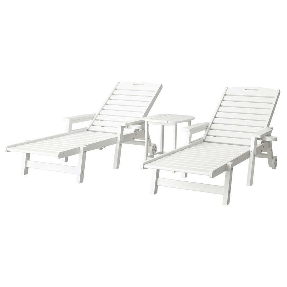 Upgrade your outdoor relaxation with the Gardeon 3-Piece Set! This versatile combo includes two 4-position adjustable chaise lounges and a durable HDPE side table, perfect for poolside, patio, or beach use. The lounges feature reclining backrests for sunbathing, reading, or napping, with 150kg weight capacity, weatherproof HDPE wood-grain construction, and stainless steel frames. Effortlessly move them with rolling wheels and handles. The matching side table is fade-resistant, supports 91kg, and includes water-draining slats and safety-curved edges. Zero maintenance��just wipe clean! Quick assembly lets you enjoy instant comfort. Ideal for stylish, hassle-free outdoor living!