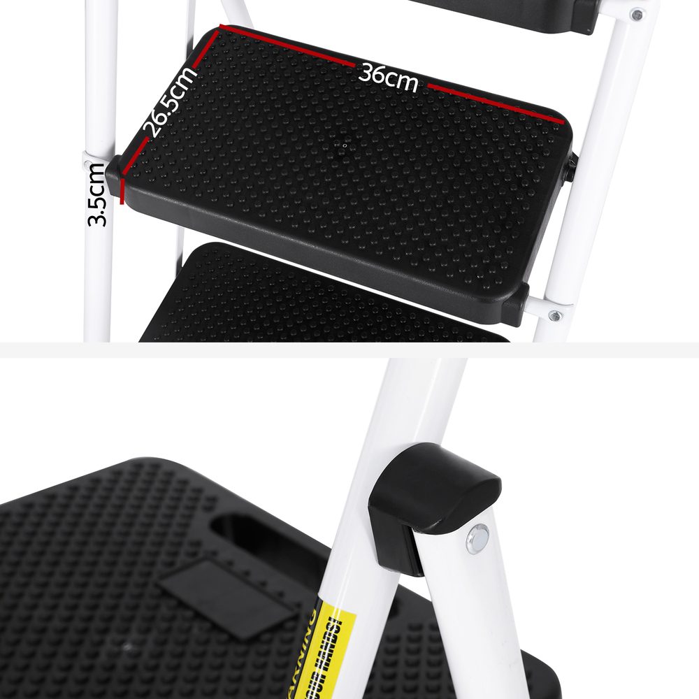 Climb your way to the top with the Giantz 4-step Ladder. Made from a lightweight steel construction, the step ladder is easy to carry but incredibly stable. The secure design and additional bracing make the step ladder extra safe and stable when working at height. It features a non-slip tread on each step, a foam easy-grip safety handle, two side handrails and non-slip rubber feet to prevent slipping and floor damage. With a tool bag ready and in reach, you’ll never be stuck without your essential tools for the job.The ladder folds down easily, so you can slip it into any storage space. It is easy to carry and suitable for all kinds of odd jobs on any surface, indoors or outdoors. No matter what needs work around your home, have a Giantz 4-step Ladder at the ready!