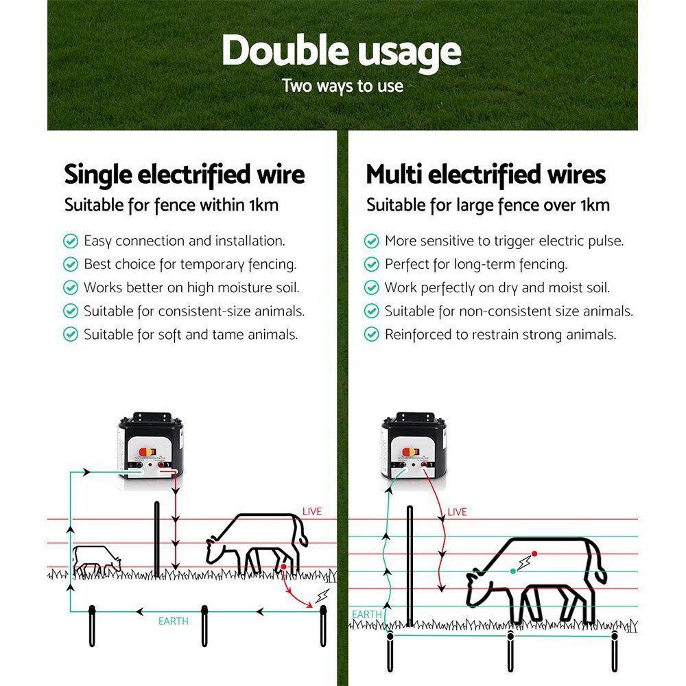 Ever worried about livestock and animals escaping your property? This 8km Solar Electric Fence Energiser is the ideal product for you. Whether it is used on the farm or just around your suburban home, the solar fence energiser can perform effectively in either environment. Featuring a simple installation design, you can have it up in a matter of minutes. Our range of solar electric fence energiser is compact, lightweight and versatile; making it an effective low maintenance item around the property. If the fence is activated by an animal, the unit will generate a brief pulse, as the voltage will drop from 8KV to 1.2KV; to prevent harmful electric shocks.
