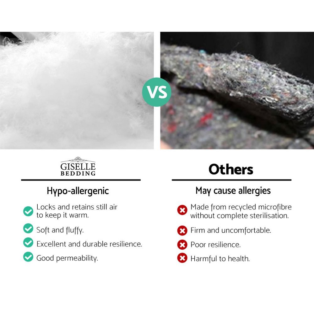Having a good night’s sleep is more than just having a great mattress. You need equally great pillows too. And our Giselle Bedding King Size Polyester Pillow is guaranteed to give you better sleep in more ways than one. First of all, the larger king size means the pillow provides better support all around, especially if you like to lean on the bedhead and do a bit of reading before you go to sleep. The polyester fibre filling is fluffy and soft, highly breathable and sweat absorbent to allow for a comfortable sleep all night long. The set of four pillows comprises two medium pillows and two firm pillows to accommodate every sleeping position. The medium pillow is good for back sleepers while the firm pillow suits side sleepers. Every pillow is housed in a 100% cotton cover that is soft to the touch and skin friendly. Perfect for your home or in commercial settings such as a hotel or Airbnb, our polyester fibre-filled pillow absolutely deserves a prime sleeping spot in any luxurious rest.