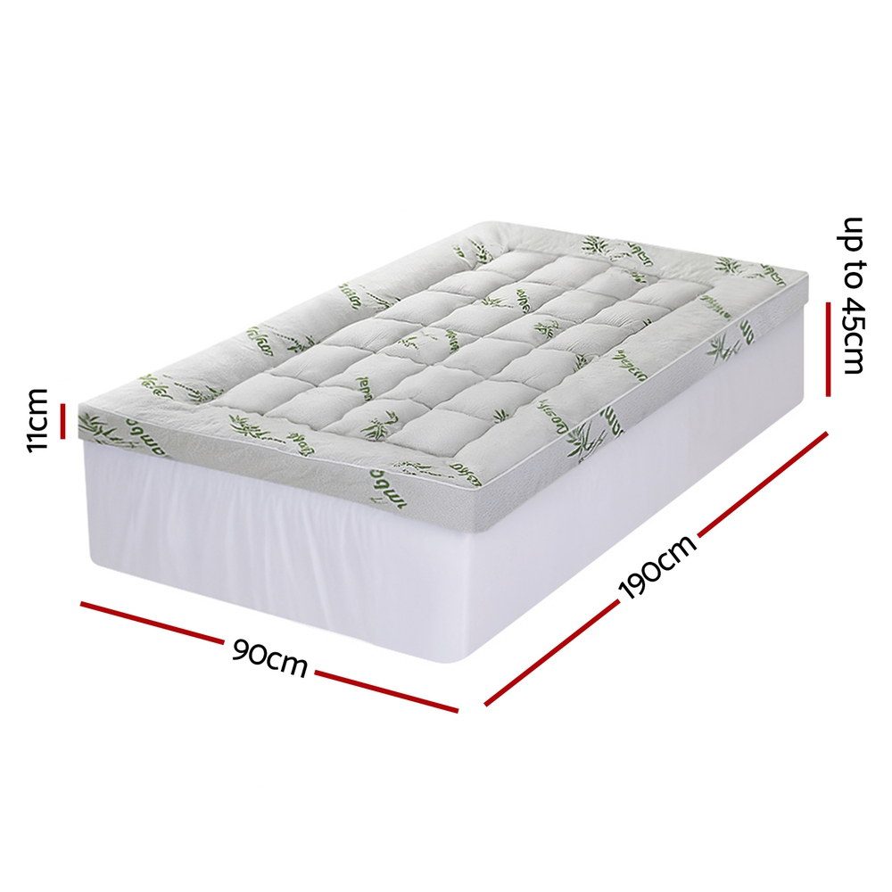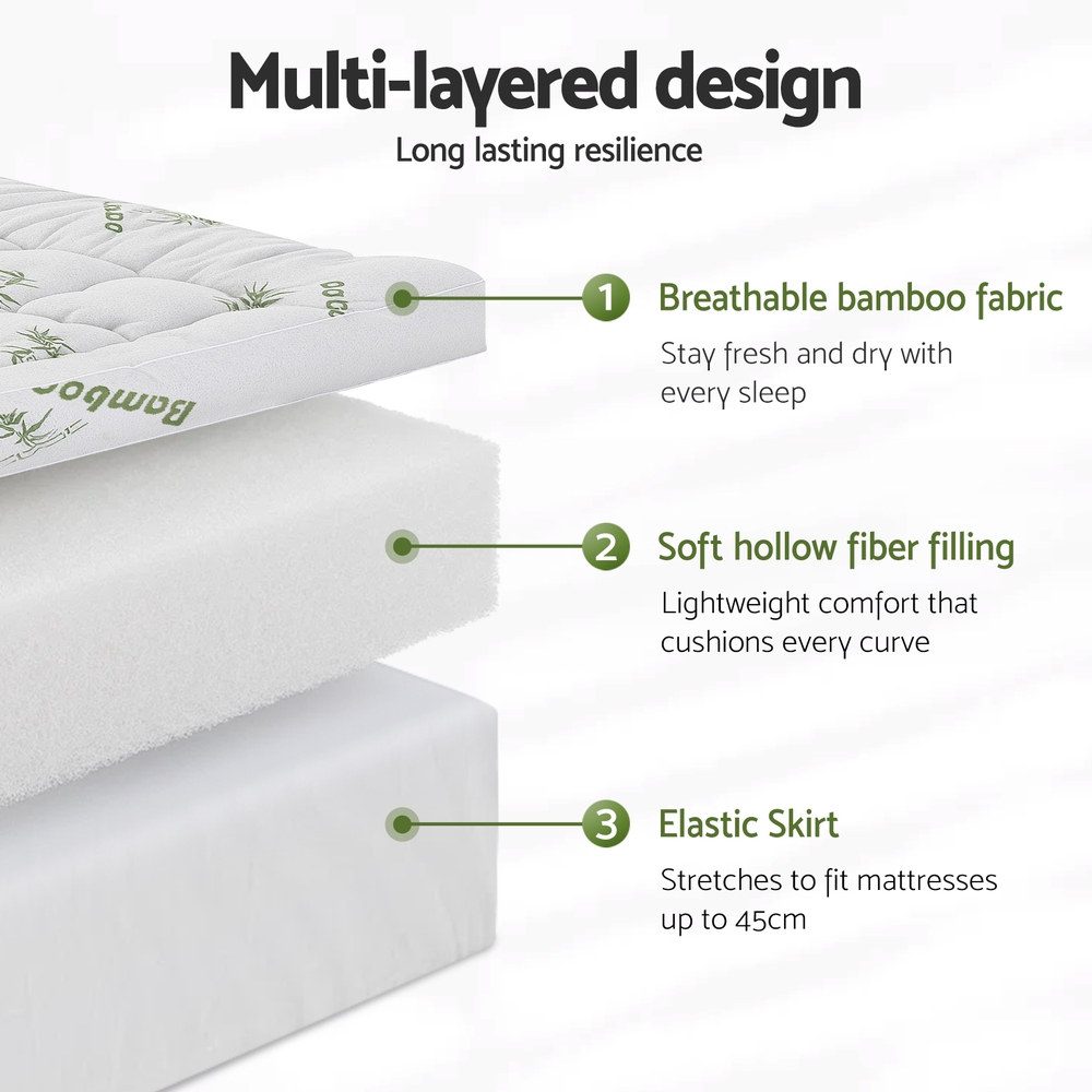 Elevate your sleep with the Giselle Bedding Pillowtop Topper, featuring an 11cm plush profile of 1500GSM hollow fiber beneath premium bamboo fabric. The 3D wave-check quilting enhances airflow while distributing weight evenly across your mattress. Designed for deep mattresses up to 45cm, this highly breathable topper arrives vacuum-packed for hygiene and is machine-washable for effortless maintenance.