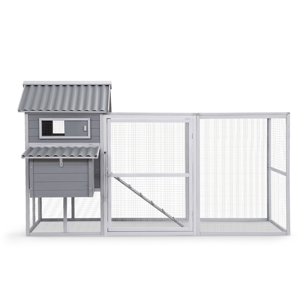 Give your feathered friends a safe and comfortable home with this spacious chicken coop. Designed for practicality, the large enclosed play area features an integrated ramp for easy access and includes a dedicated hatching box for convenient egg collection. Built tough to handle our climate, the coop is constructed from durable, weather-resistant fir wood and topped with a sloped PVC roof for effective rain runoff.Rest easy knowing your chooks are secure thanks to the strong, powder-coated galvanised wire mesh and reliable latches. Cleaning is a breeze with the handy slide-out tray. Provide your chickens with a secure, durable, and easy-to-maintain shelter.