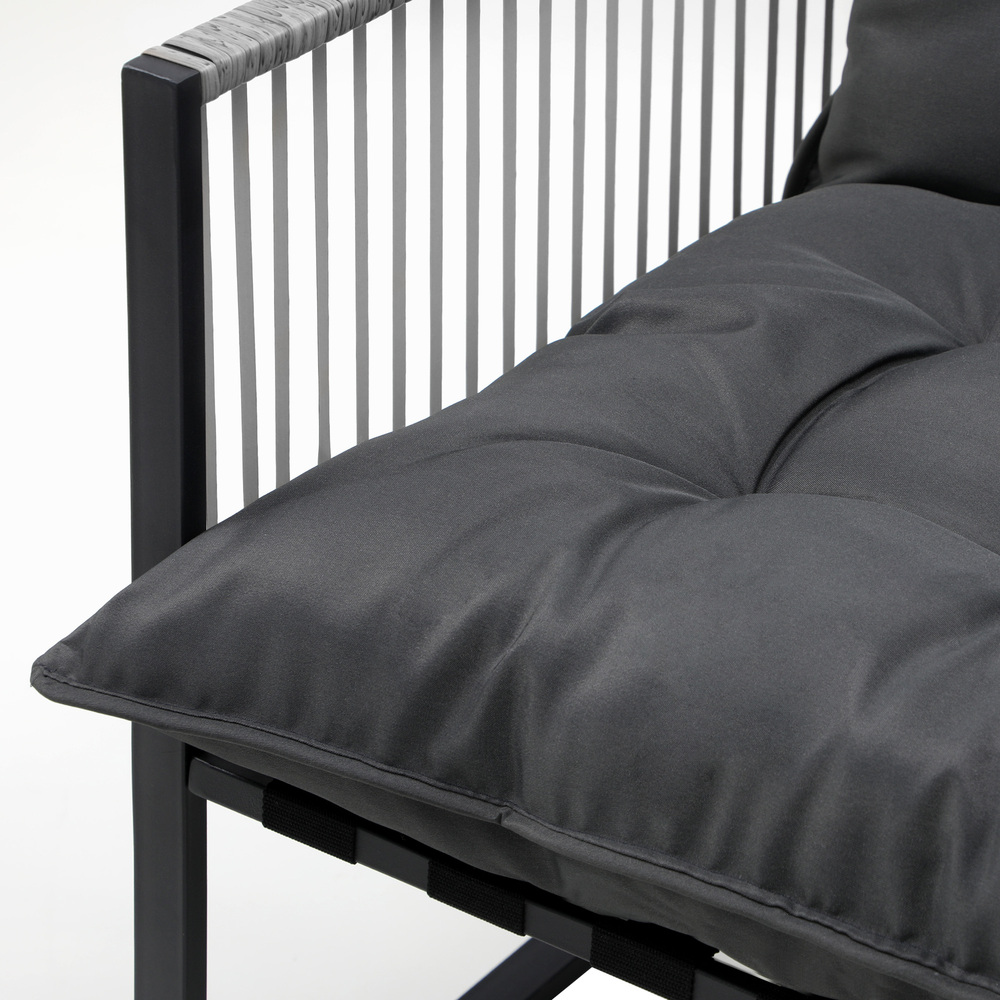 Stylish. Contemporary. Cool. Such as the stringed PE wicker embellishments that add plenty of charisma and character to the chair. It has all the hallmarks of chic outdoor furniture that resonate with your discerning lifestyle. Sit back and feel the comfort of the well-padded cushioned seat and backrest and relax your arms on the smooth and supportive armrests.