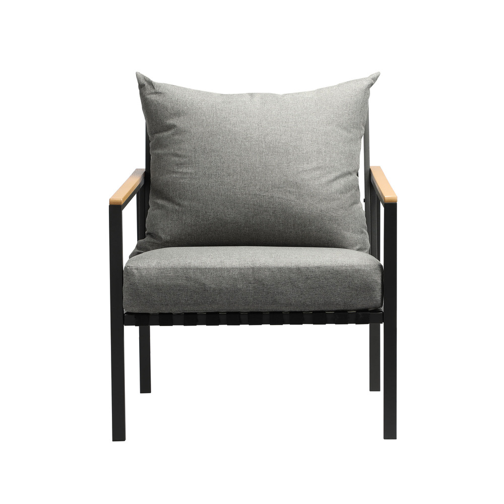Naturally, we ensure that the furniture piece is made with responsible and sustainable processes. Such as the eco-friendly wood material lining the armrests that not only looks good, but also display long-lasting qualities. Not to be outdone, the frame is made of heavy-duty powder-coated steel to enable robust use and high load bearing. Comfort is also not forgotten as the armchair features thickly padded high resilience cushions and an angled backrest that is perfected to let you seat for hours with nary a complaint.