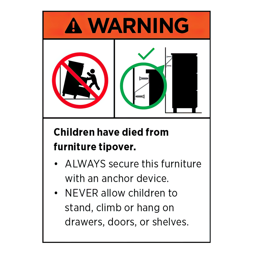 WARNING: Children have died from furniture tipping over. Always secure furniture to prevent serious injury or death. Never allow children to climb or stand on furniture.