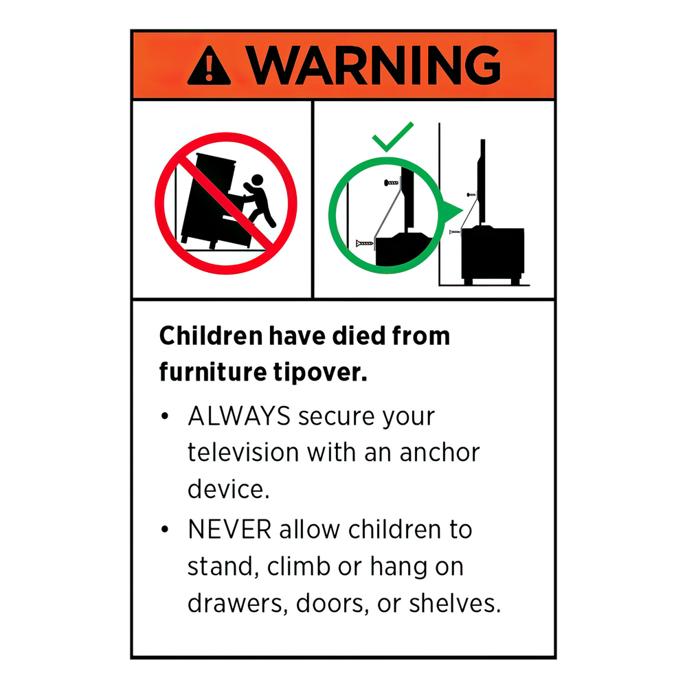 WARNING: Children have died from furniture tipping over. Always secure furniture to prevent serious injury or death. Never allow children to climb or stand on furniture.